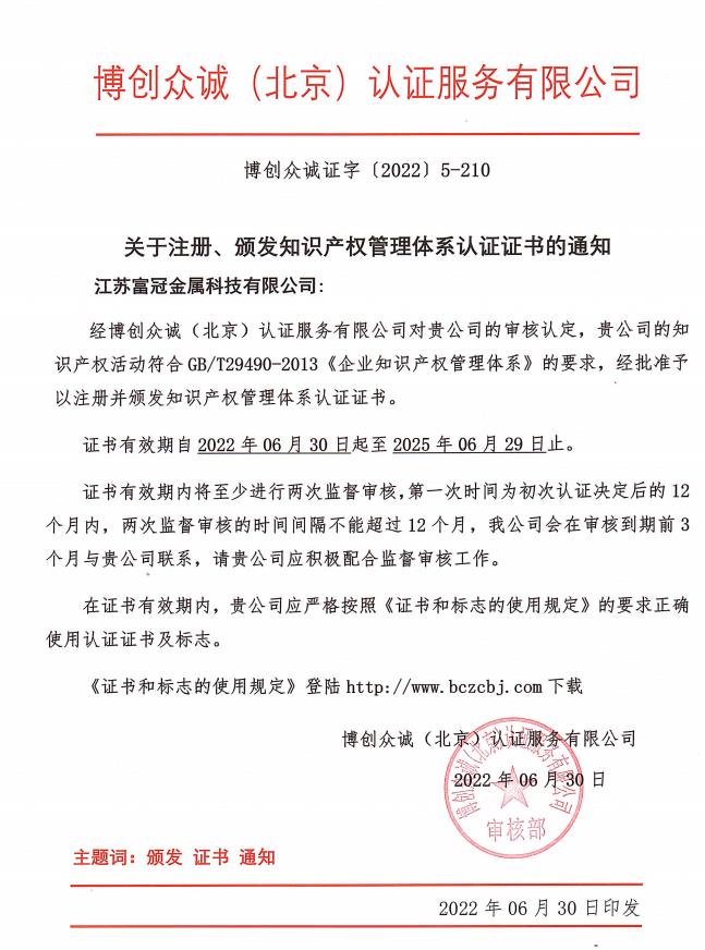知識產權管理體系認證證書